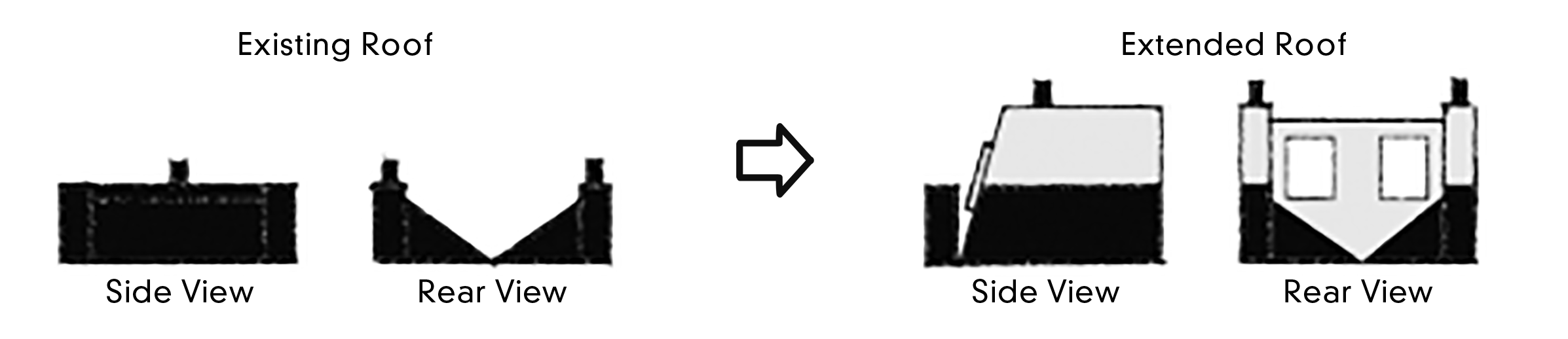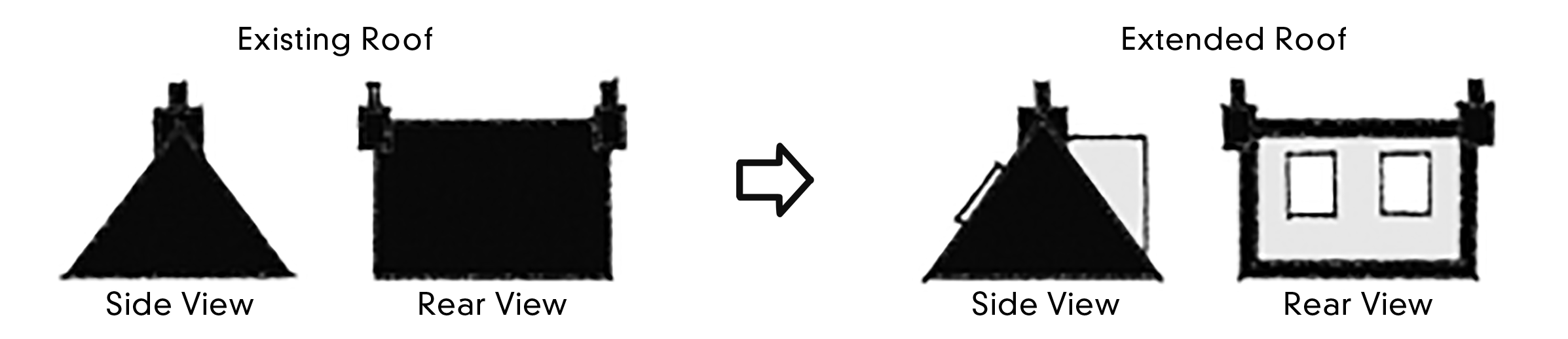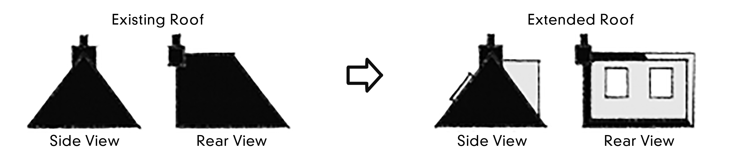 This is where the ridge height of the roof stays the same but a portion of the roof protrudes out often in a box-like shape. It can be a small section just containing a window (called a dormer window) or the width or length of the roof space.
