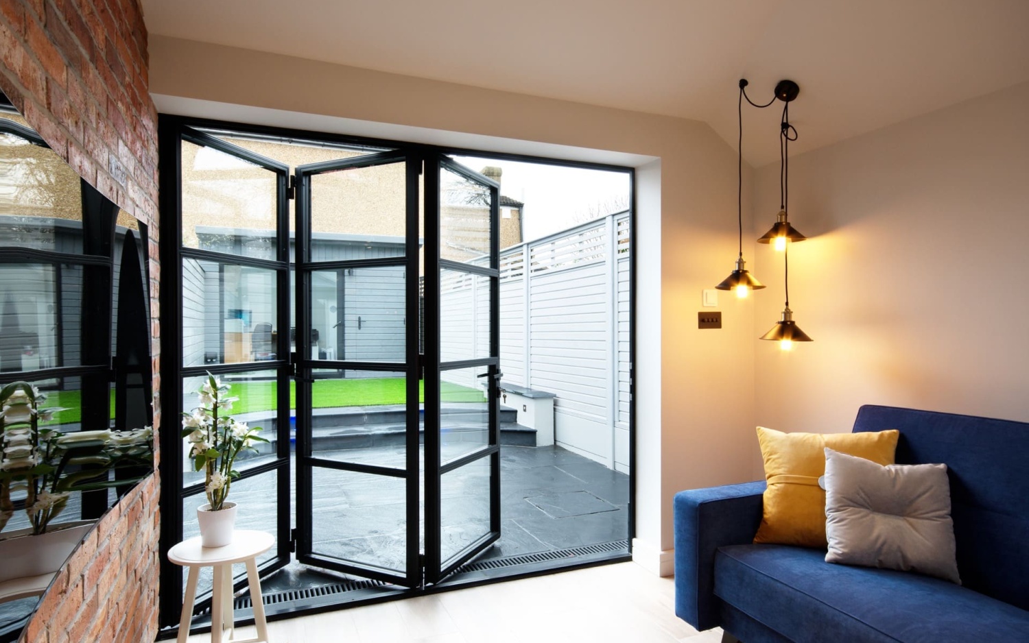 Black steel framed doors to side and rear extension