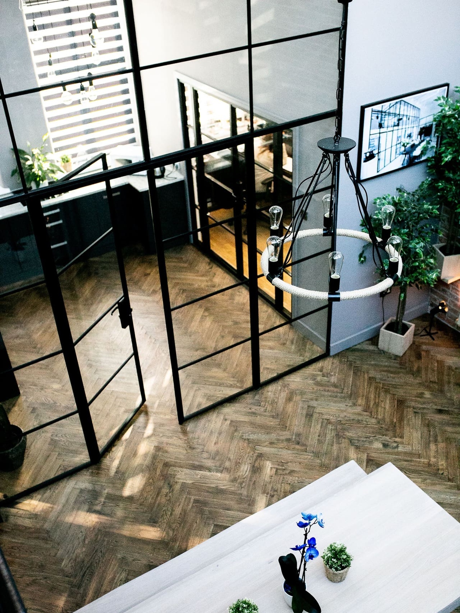Interior black steel framed doors between hall and living area